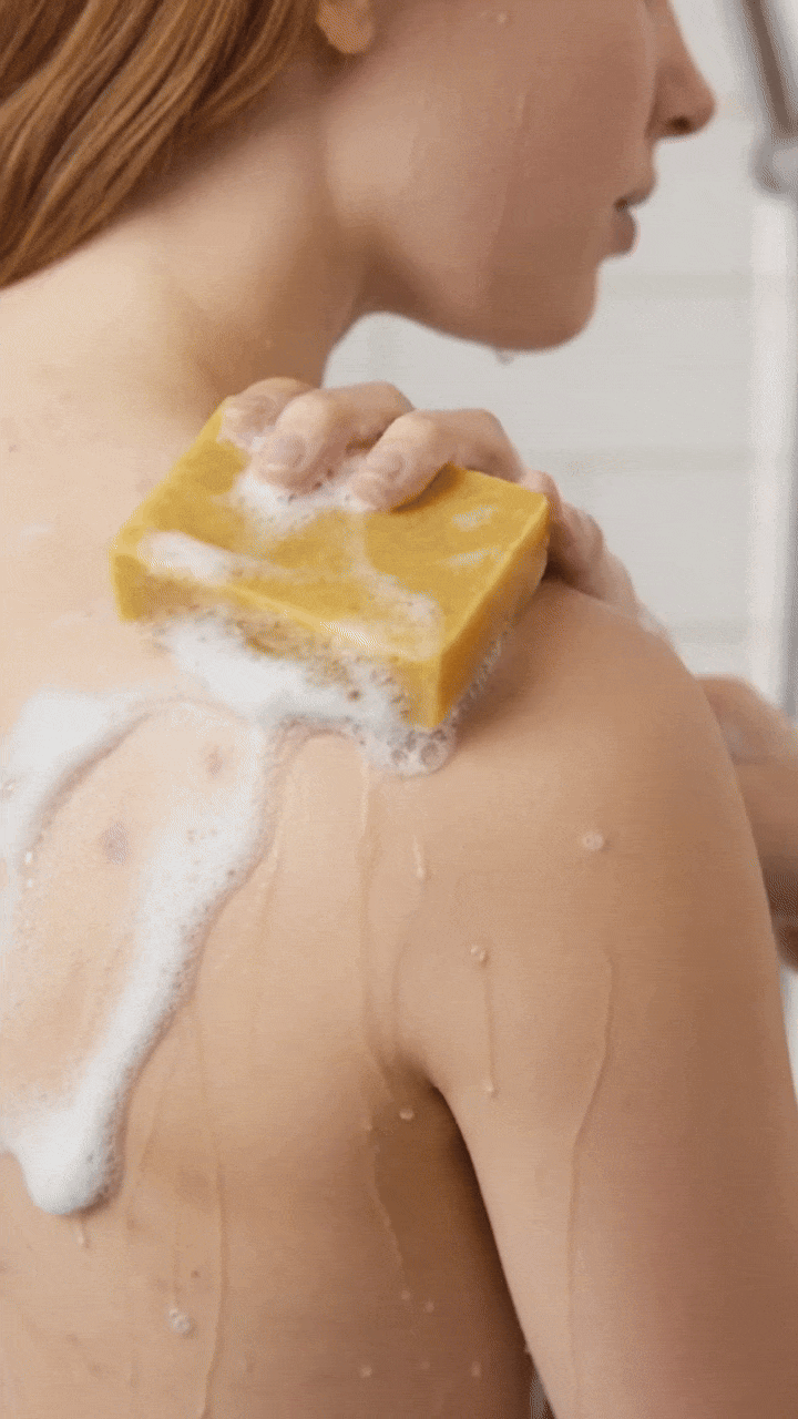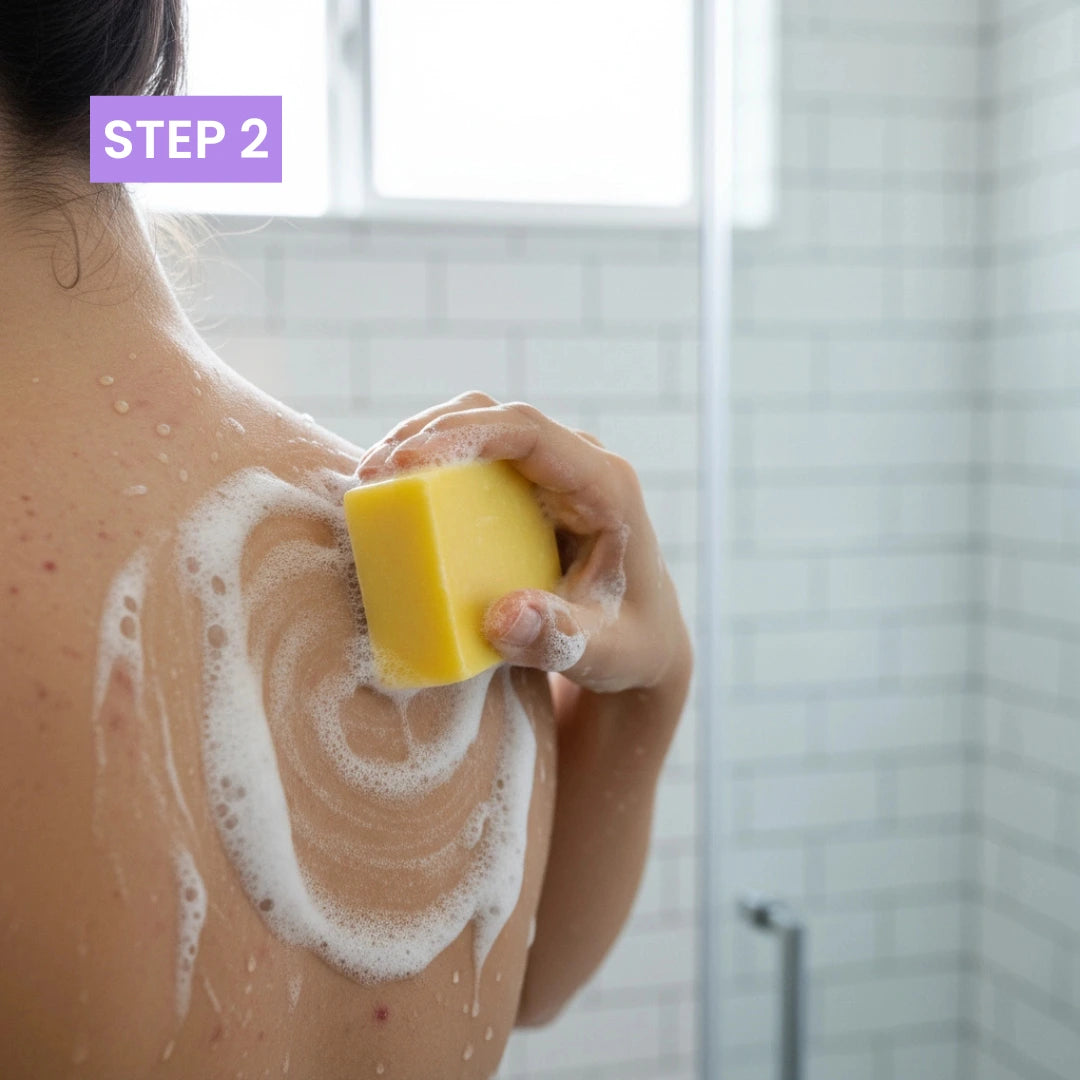 2. Lather soap and gently massage into skin for 30–60 seconds.